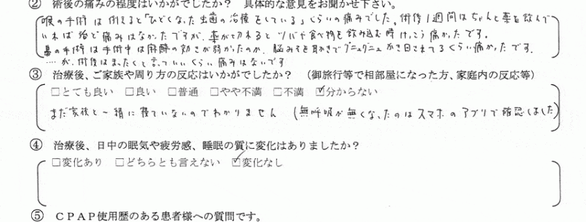 大学病院で無呼吸症候群と診断されて大学病院ではCPAPばかりすすめられてイヤだったので、こちらで手術をお願いしました。お陰様で無呼吸の症状は落ち着いたみたいですが、いびきの方はちょっとしか効果がなかったので『どちらともいえない』にしました