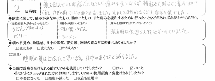 イビキは劇的に減り、周りを気にせず寝られるようになりました。覚悟していた痛みも拍子抜けなくらい少なく、後遺症もありません。医院の方の対応も非常に丁寧で不安が少なくてすみました。