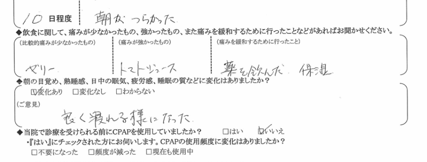 A: 若干、喉に違和感があるが気にならない程度。イビキ・無呼吸で悩んでいた時と比べたら全然気にならない。