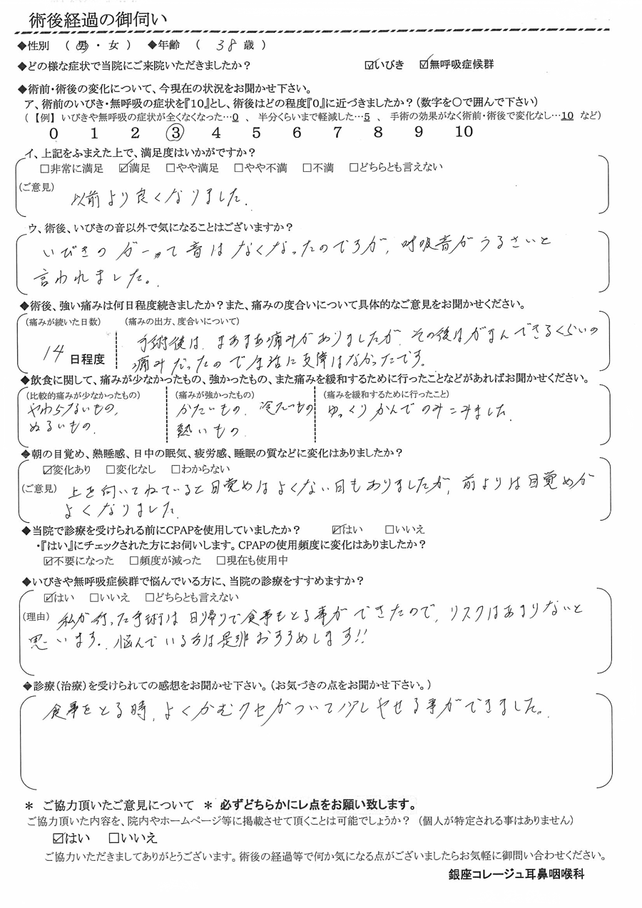 ア, 術前のいびき・無呼吸の症状を『10』だったとすると、術後はどの程度になりましたか? 【3】