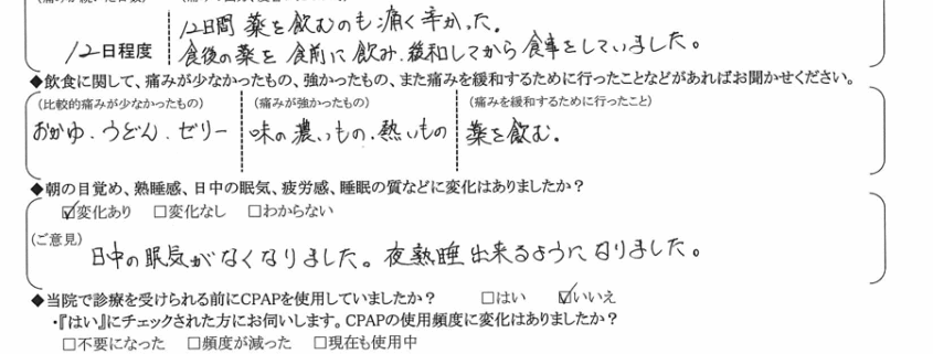 (ご意見) 日中の眠気が無くなりました。夜、熟睡できるようになりました。