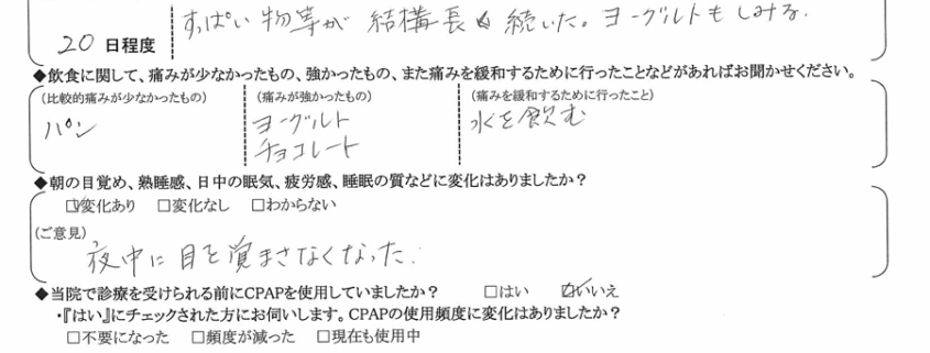 (理由) 思ったより痛みが強く、長かったので、違和感はいすれ無くなるかもしれないが食事が美味しくなった。