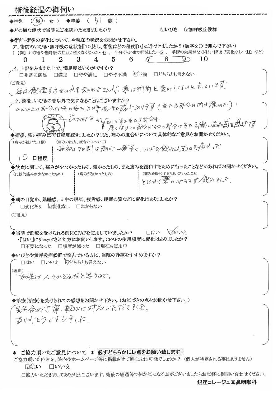(ご意見) 毎日飲酒するせいかもしれませんが、妻は「術前と変わらない」と言っています。