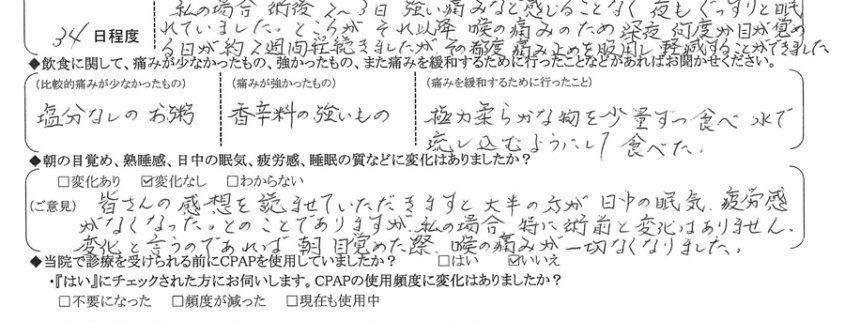 (ご意見) 皆さんの感想を読ませて頂きますと、大半の方が「日中の眠気・疲労感が無くなった」との事でありますが、私の場合は特に術前と変化はありません。変化と言うのであれば、朝目覚めた際、喉の痛みが一切なくなりました。