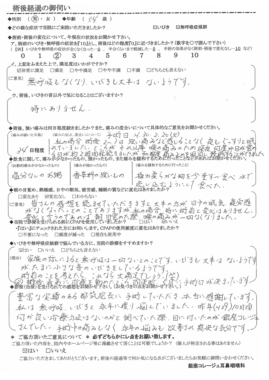 (理由) 家族の話によると、無呼吸は一切ないとの事です。イビキも大半は無いようですが、たまに小さな音のイビキをしているようです。術前の事を考えたら、これなら大満足でしょう。(笑)