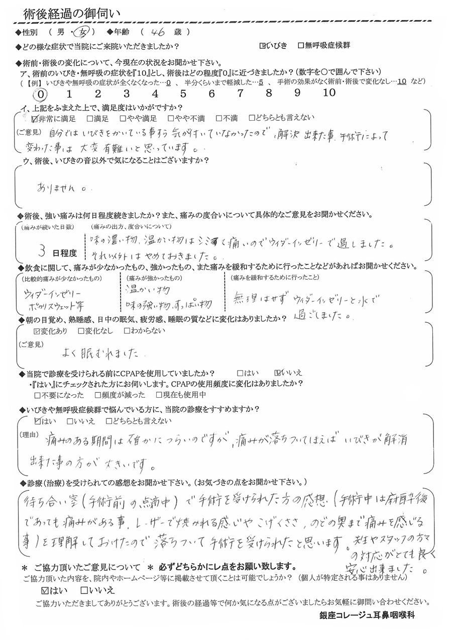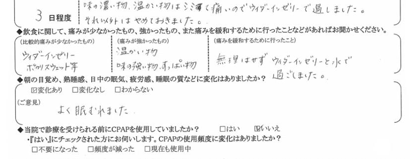 (理由) 痛みのある期間は確かに辛いですが、痛みが落ち着いてしまえばイビキが解消できた事の方が大きいです。