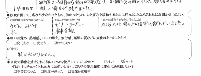 (痛みの程度について) 術後2~3日目から痛みが強くなり、副鼻腔炎の時の酷い頭痛のような激しい痛みが続きました。