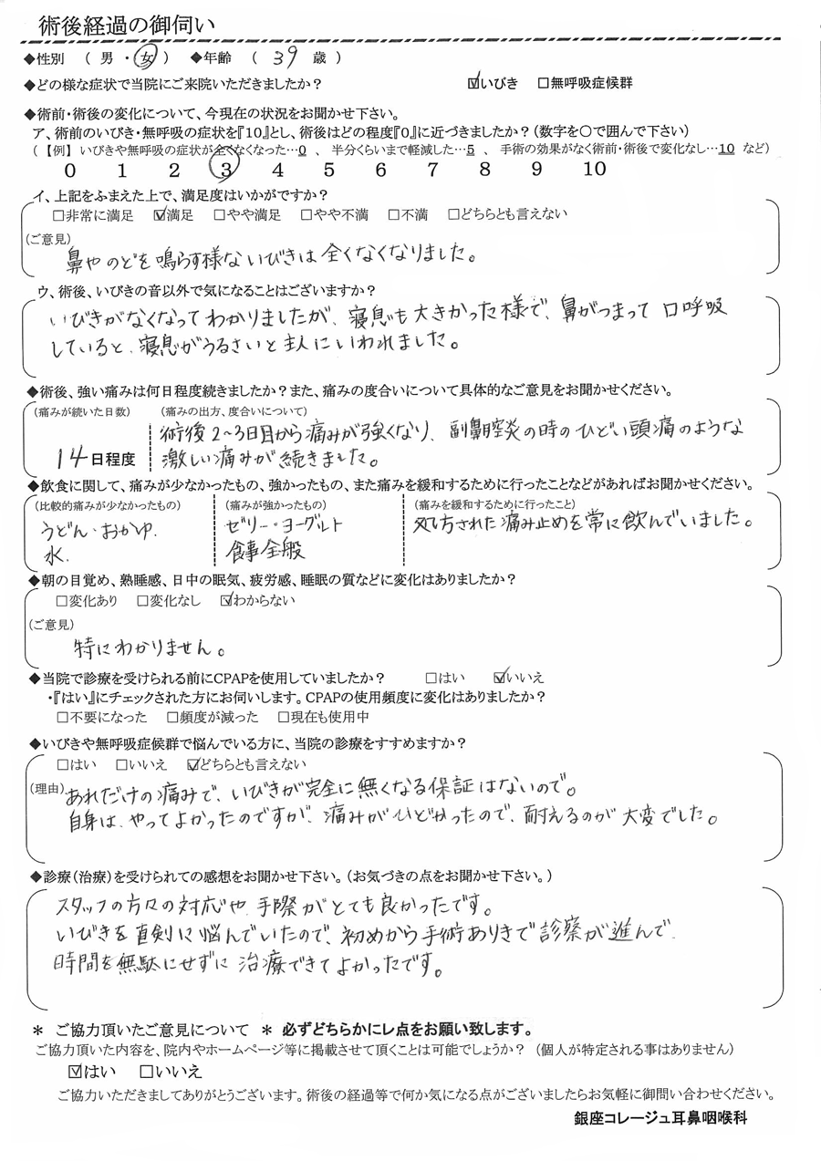 A:スタッフの方々の対応や、手際がとても良かったです。イビキを真剣に悩んでいたので、初めから手術ありきで診察が進んで時間を無駄にせずに治療できて良かったです。