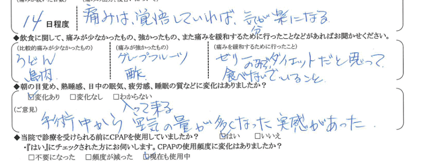 Q.術後、強い痛みは何日程度続きましたか?また、痛みの度合いについて具体的なご意見をお聞かせください。