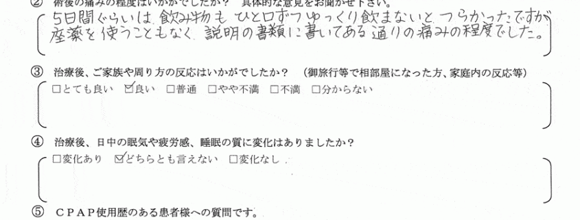 ウ、いびきの音以外で、術後気になる点はございますか?