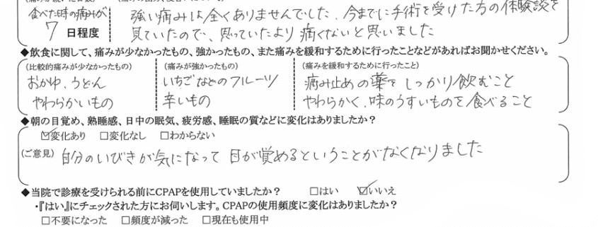 (ご意見) 自分のイビキが気になって、目が覚めるという事が無くなりました。