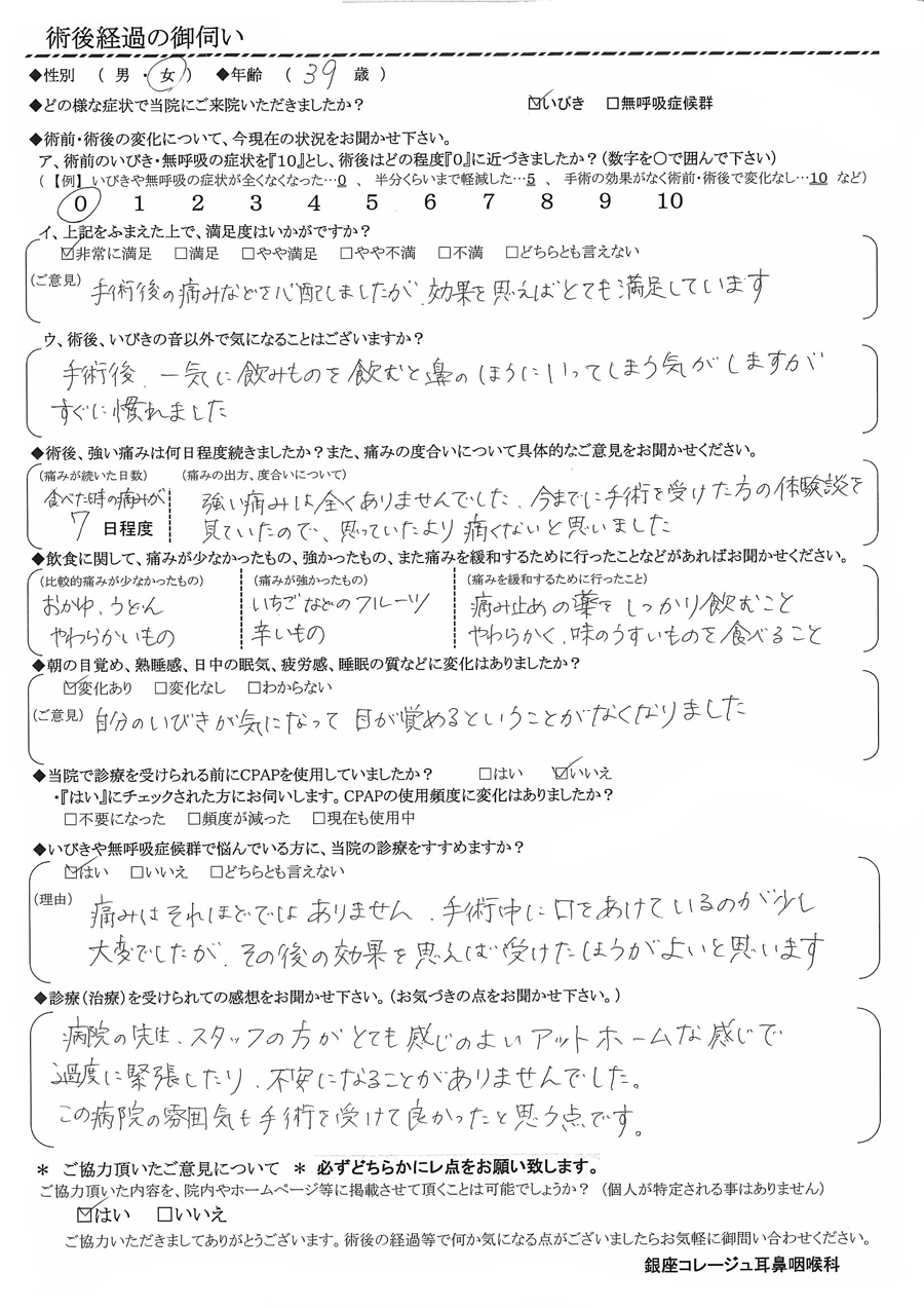ア, 術前のいびき・無呼吸の症状を『10』だったとすると、術後はどの程度になりましたか? 【0】