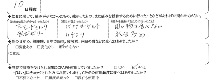 A:(痛みを緩和するために行ったこと) 硬い物は食べない・水分多め