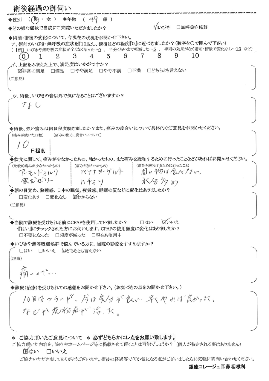 ア, 術前のいびき・無呼吸の症状を『10』だったとすると、術後はどの程度になりましたか? 【0】