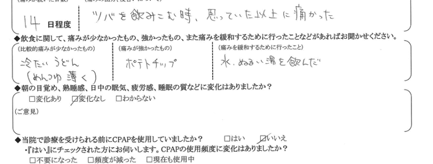 (痛みの程度について) 唾を飲み込む時、思っていた以上に痛かった。