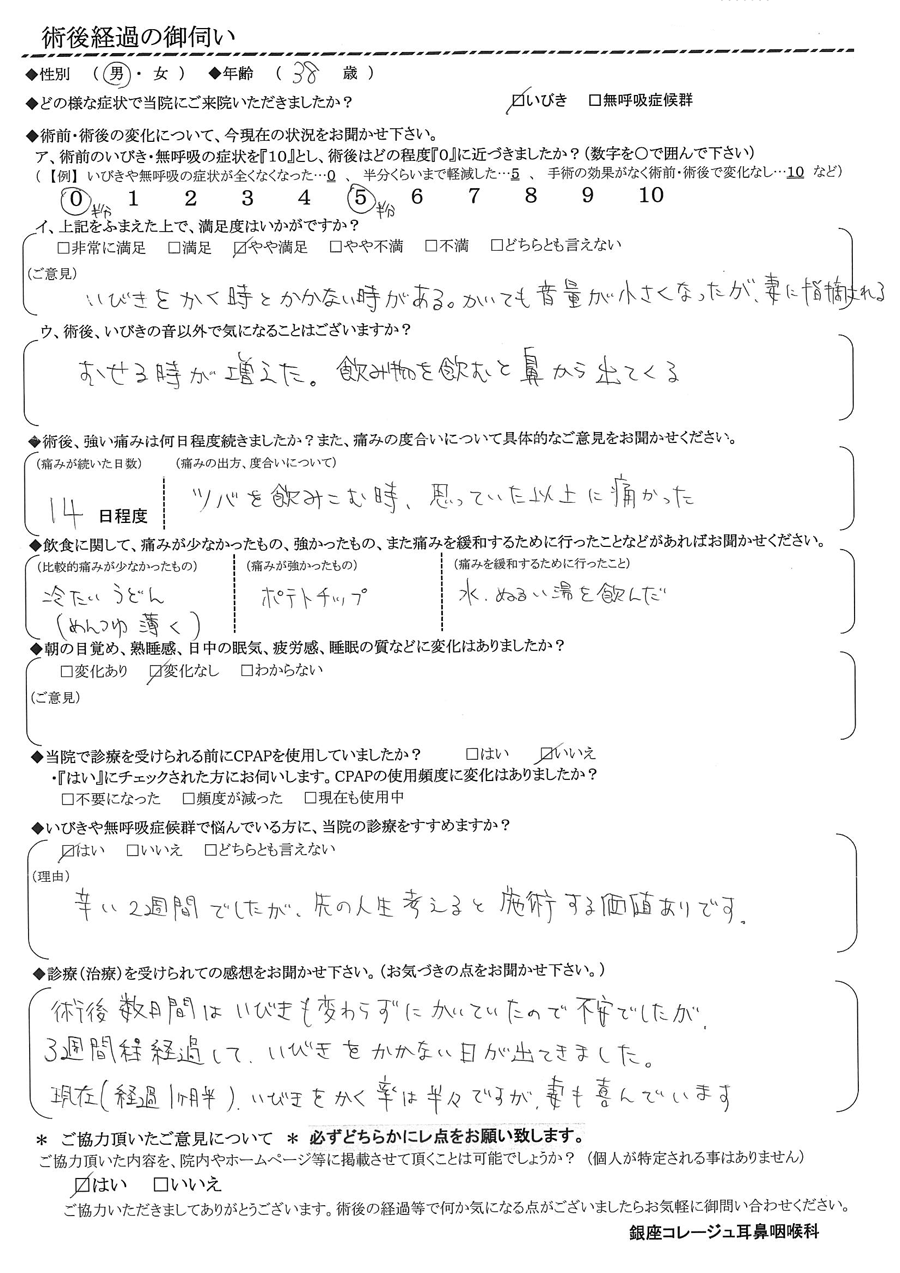 A:術後数日間はイビキも変わらずにかいていたので不安でしたが、3週間程経過して、イビキをかかない日が出てきました。現在(経過一ヶ月半)、イビキをかく率は半々ですが妻も喜んでいます。