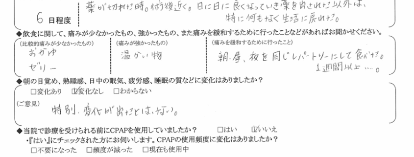 A:イビキ治療をさせて頂きました。例えば、「この治療をしても何となくなぁー」っと思ったりした人がいて、