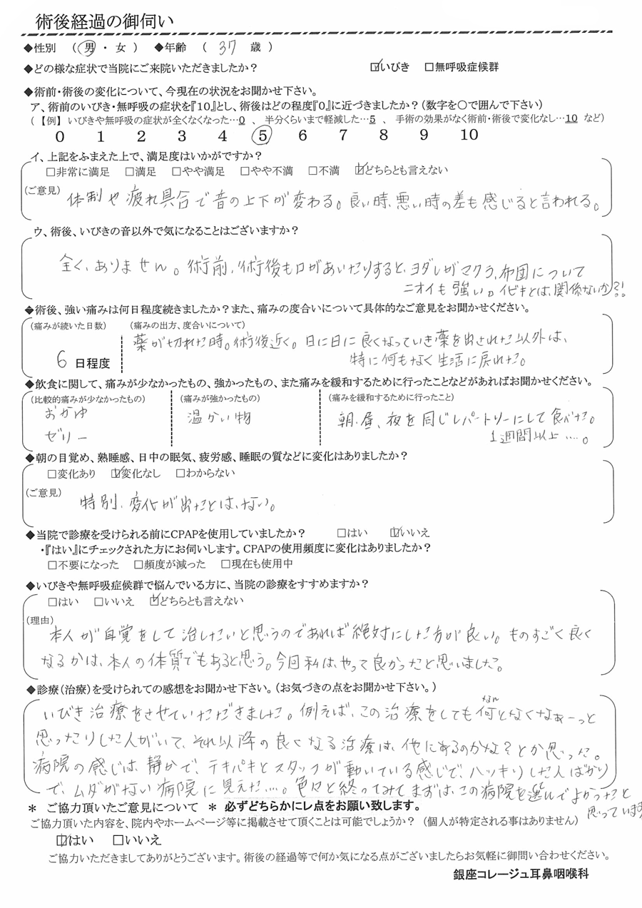 ア, 術前のいびき・無呼吸の症状を『10』だったとすると、術後はどの程度になりましたか? 【5】