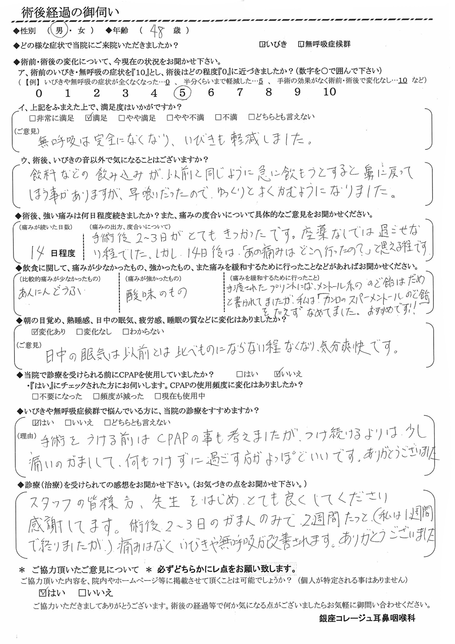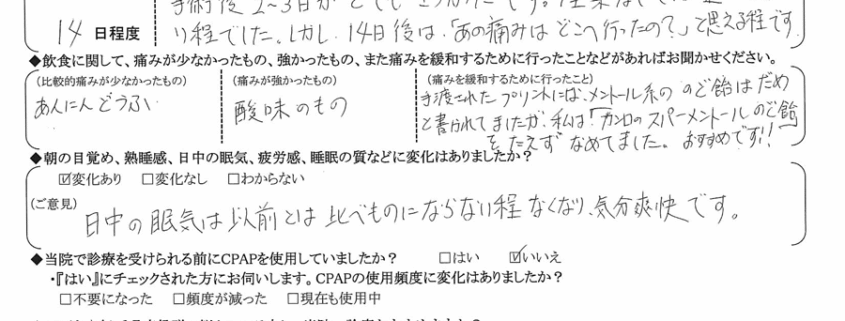 術後2~3日の我慢のみで、2週間経つと(私は1週間で終わりましたが)痛みは無く、イビキや無呼吸が改善されます。ありがとうございました。