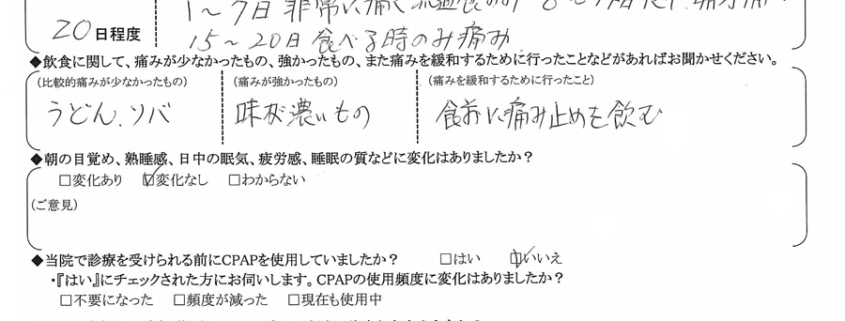 (痛みの程度について) 1~7日、非常に痛く流動食のみ。8~14日、夜中と朝方が痛い。