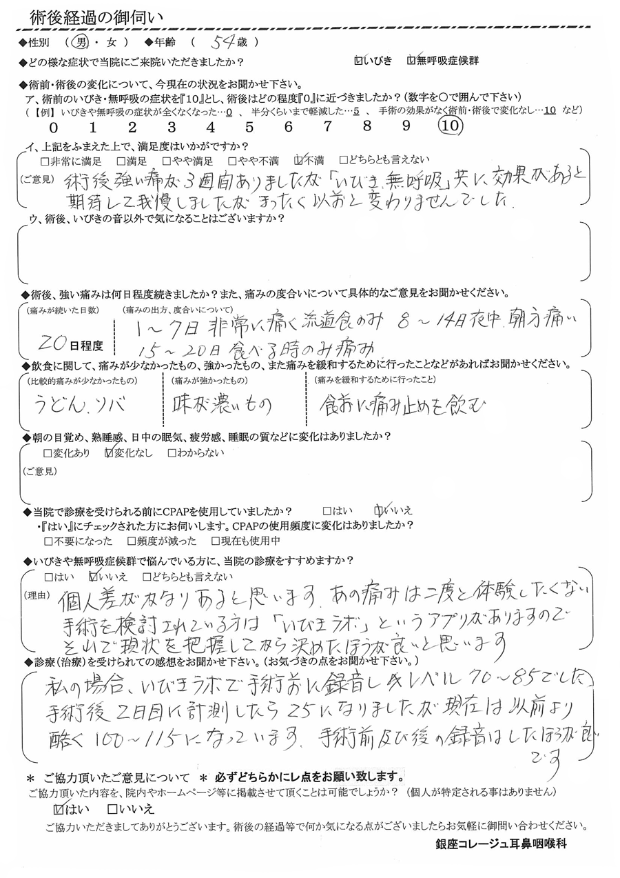 (ご意見) 術後、強い痛みが3週間ありましたが「いびき・無呼吸」共に効果があると期待して我慢しましたが、