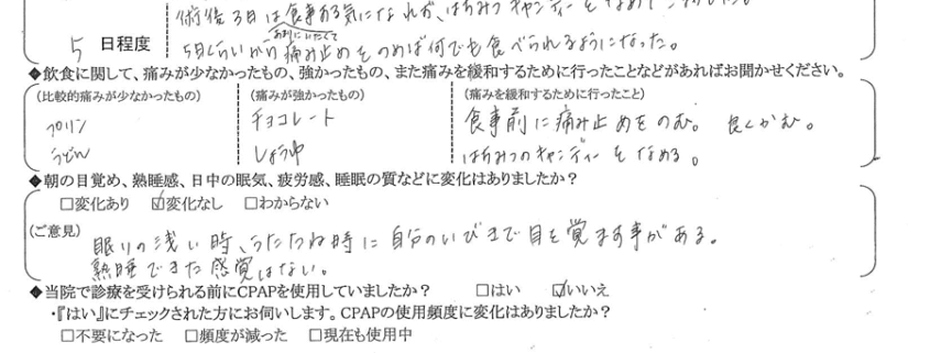 A:(痛みを緩和するために行ったこと) 食事前に痛み止めを飲む・よく噛む・蜂蜜キャンディーを舐める