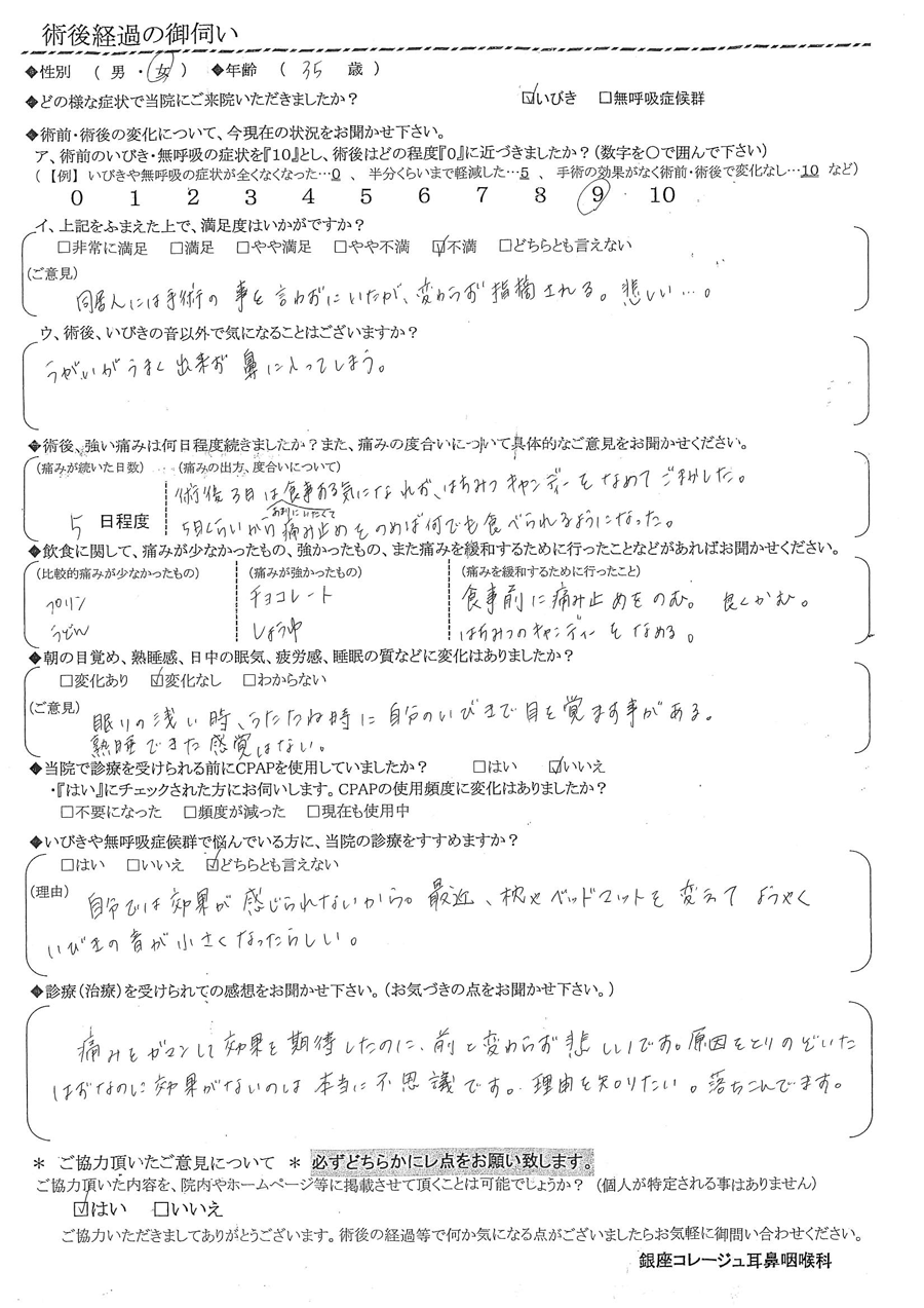ア, 術前のいびき・無呼吸の症状を『10』だったとすると、術後はどの程度になりましたか? 【9】