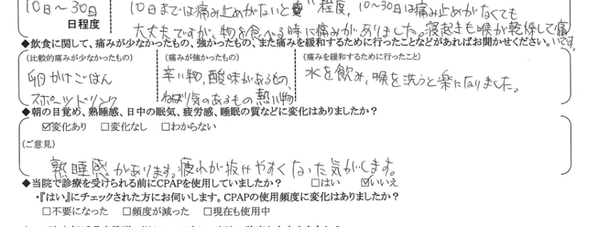 (痛みの程度について) 10日までは痛み止めがないと辛い程度。10~30日は痛み止めが無くても大丈夫ですが、物を食べる時に痛みがありました。寝起きも喉が乾燥して痛いです。