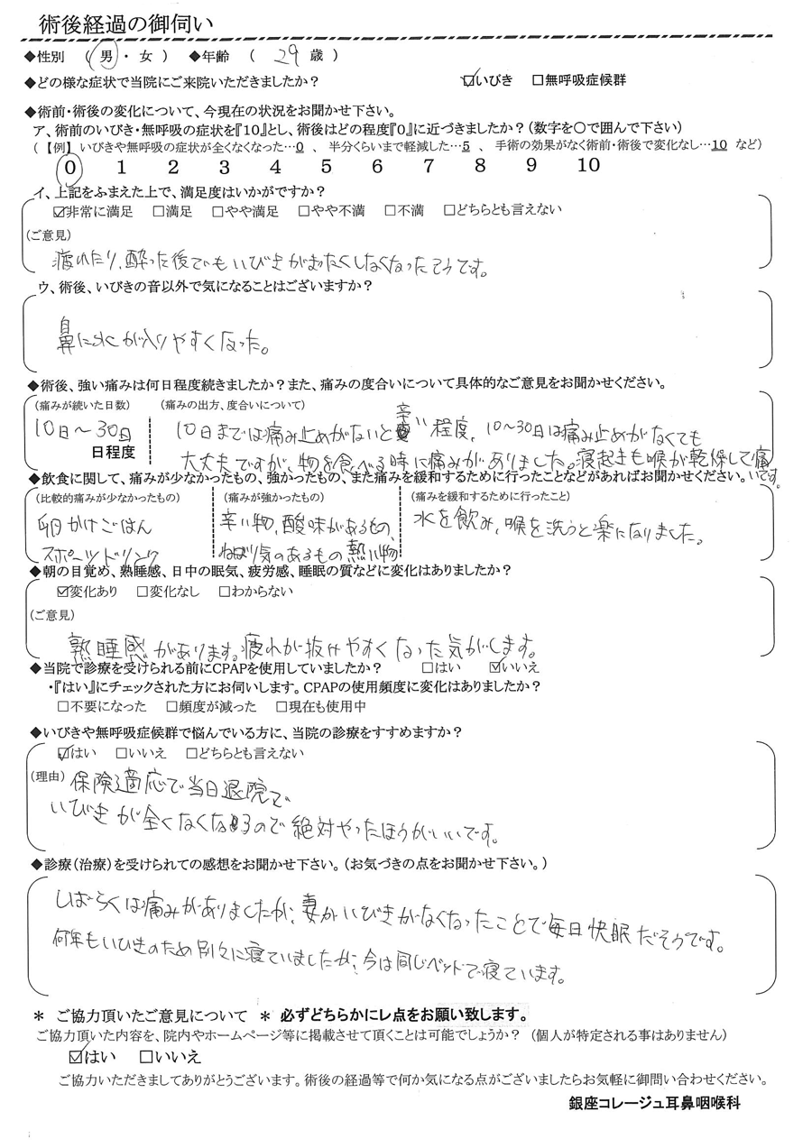 A: しばらくは痛みがありましたが、イビキが無くなった事で妻は毎日快眠だそうです。