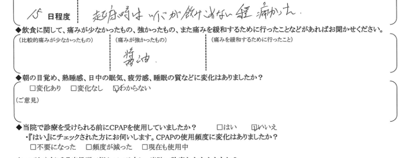 (痛みの程度について) 起床時は唾が飲み込めない程、痛かった。