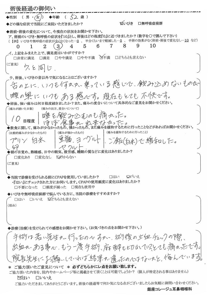 ア, 術前のいびき・無呼吸の症状を『10』だったとすると、術後はどの程度になりましたか? 【3】