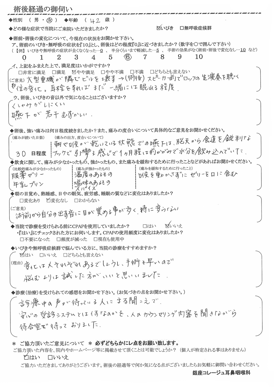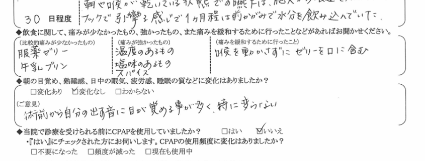 (ご意見) 術前から自分の出す音に目が覚める事が多く、特に変わらない。