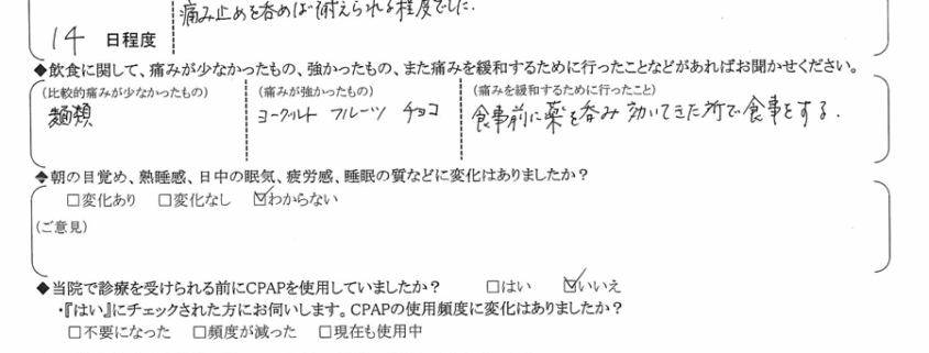 (痛みの程度について) 痛み止め飲めば、耐えられる程度でした。