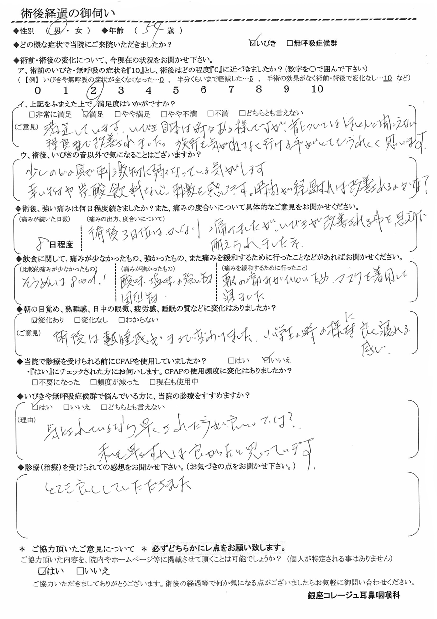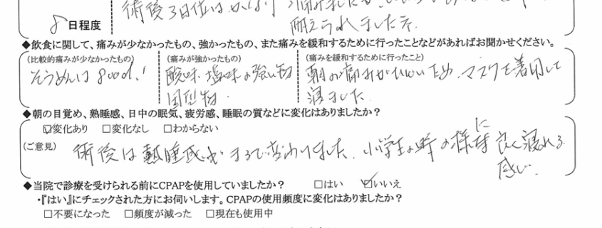 (ご意見)  術後は熟睡感がまるで変りました。小学生の時の様に良く寝られる感じ。