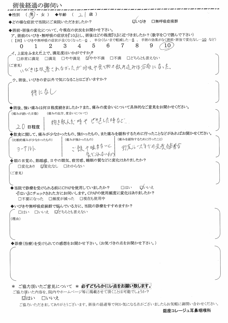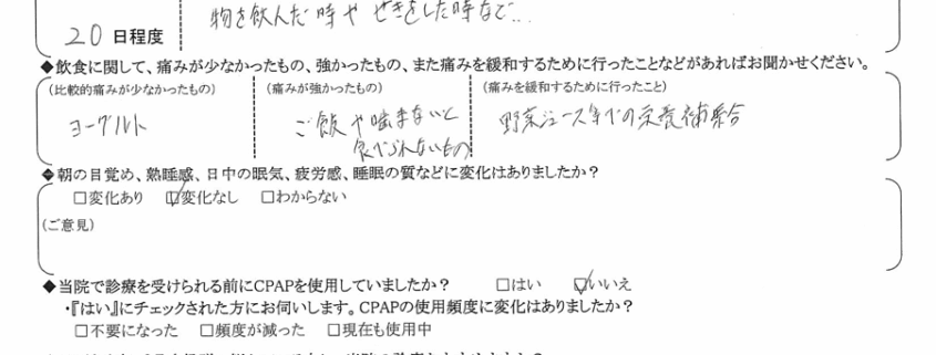 (ご意見) イビキは改善されなかったけが、呼吸や食べ物の飲み込みは容易になった。