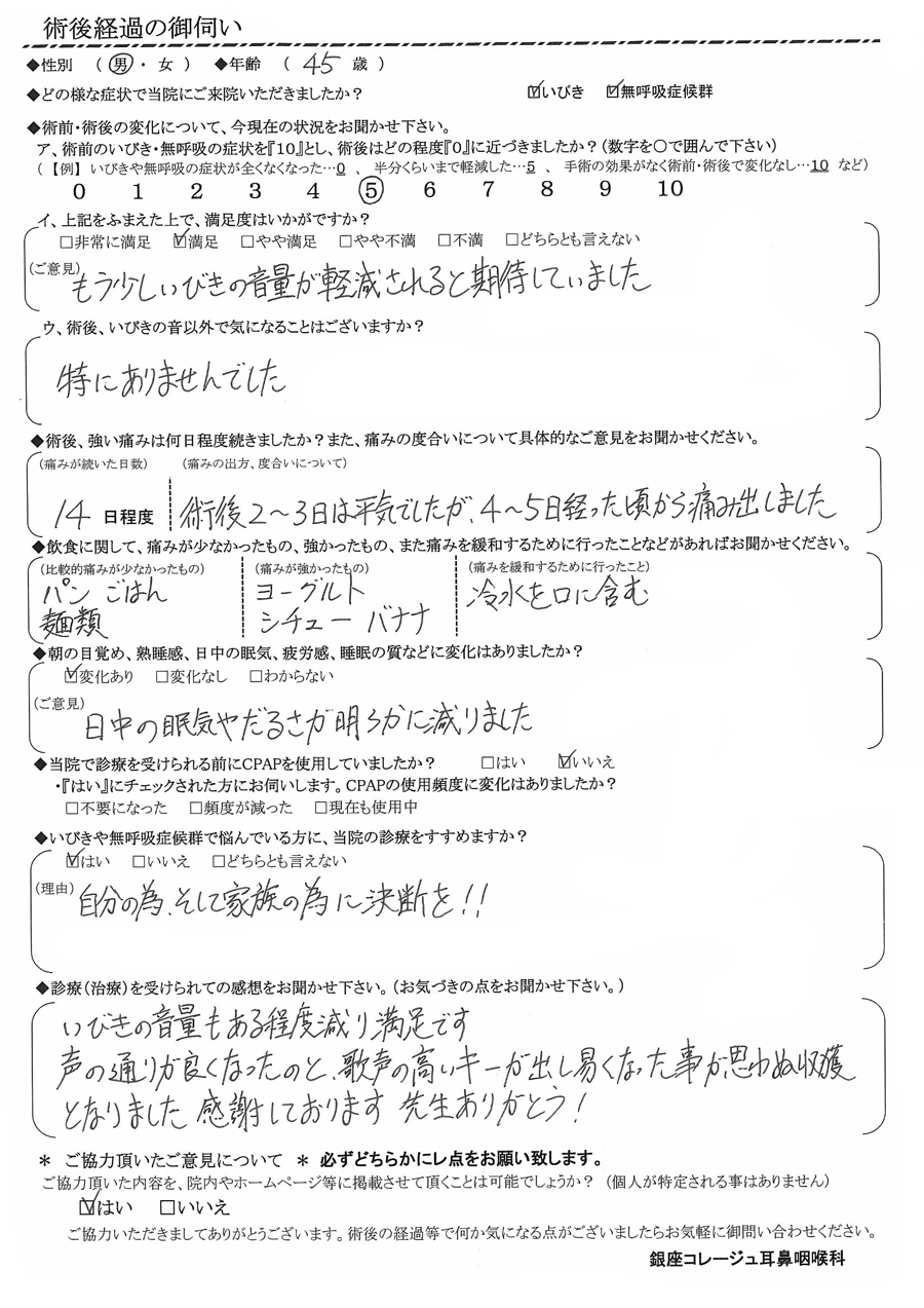 A:イビキの音量もある程度減り、満足です。声の通りが良くなったのと、歌声の高いキーが出し易くなった事が思わぬ収穫となりました。感謝しております。先生ありがとう!