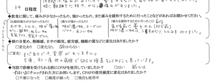 (ご意見) まだ自分では実感がありません。今度もう一度、他の病院SASの検査をしてみようと思っています。