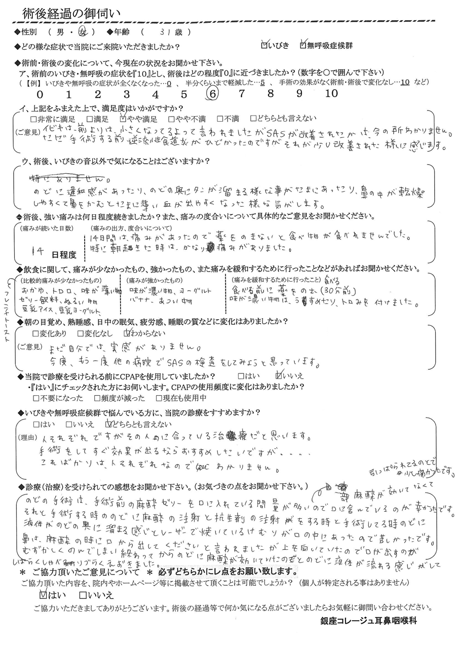 (ご意見) 「イビキは以前よりは小さくなっているよ」と言われましたが、SASが改善されたかは今のところ分かりません。ただ、手術をする前は逆流性食道炎が酷かったのですが、それから少し改善されたように感じます。