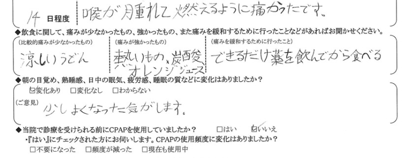 (痛みの程度について) 喉が腫れて、燃える様に痛かったです。
