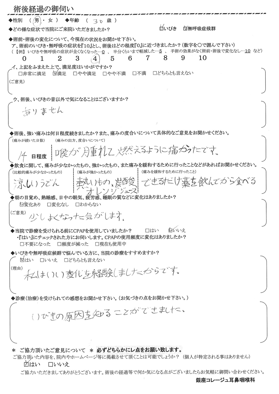 ア, 術前のいびき・無呼吸の症状を『10』だったとすると、術後はどの程度になりましたか? 【4】