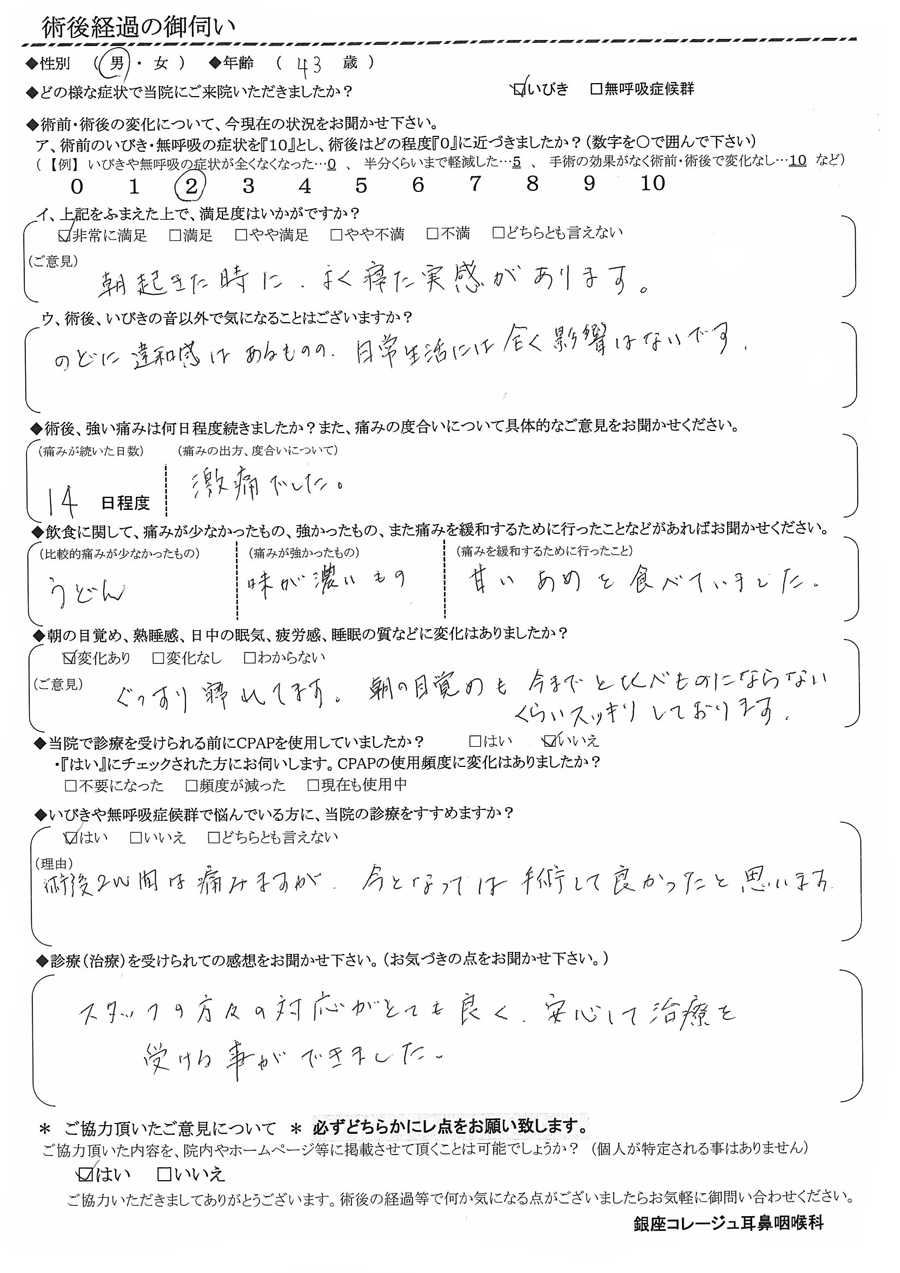 ア, 術前のいびき・無呼吸の症状を『10』だったとすると、術後はどの程度になりましたか? 【2】