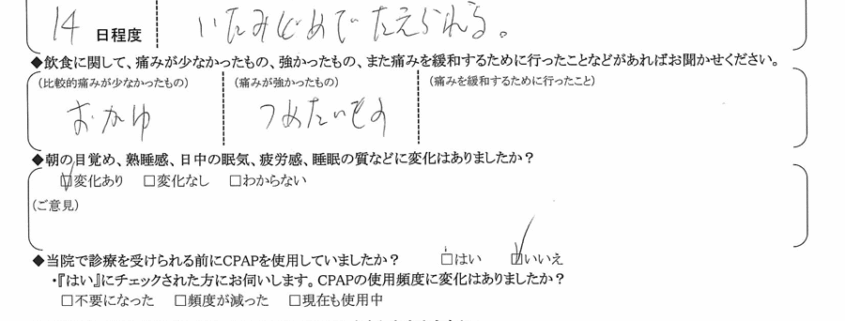 Q.術後、強い痛みは何日程度続きましたか?また、痛みの度合いについて具体的なご意見をお聞かせください。