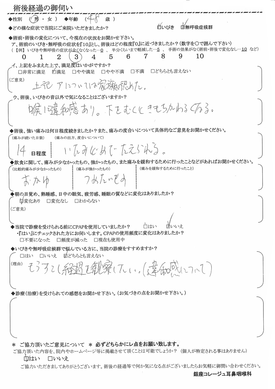 ウ、術後、いびきの音以外で気になる点はございますか?