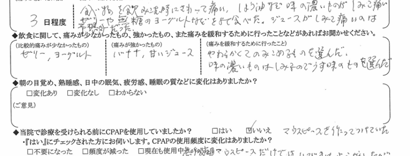 (痛みの程度について) 食べ物を飲み込む時に触って痛い。醤油など味の濃い物が沁みて痛い。ゼリーや無糖のヨーグルト等をよく食べた。ジュースが沁みて痛いのは予想外だった。