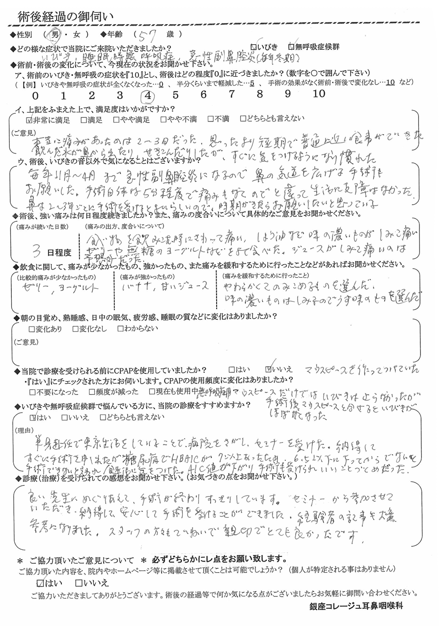 毎年11月~4月まで急性副鼻腔炎になるので、鼻の気道を広げる手術もお願いした。手術自体は5分程度で痛みも無く、喉と違って生活に支障は無かった。