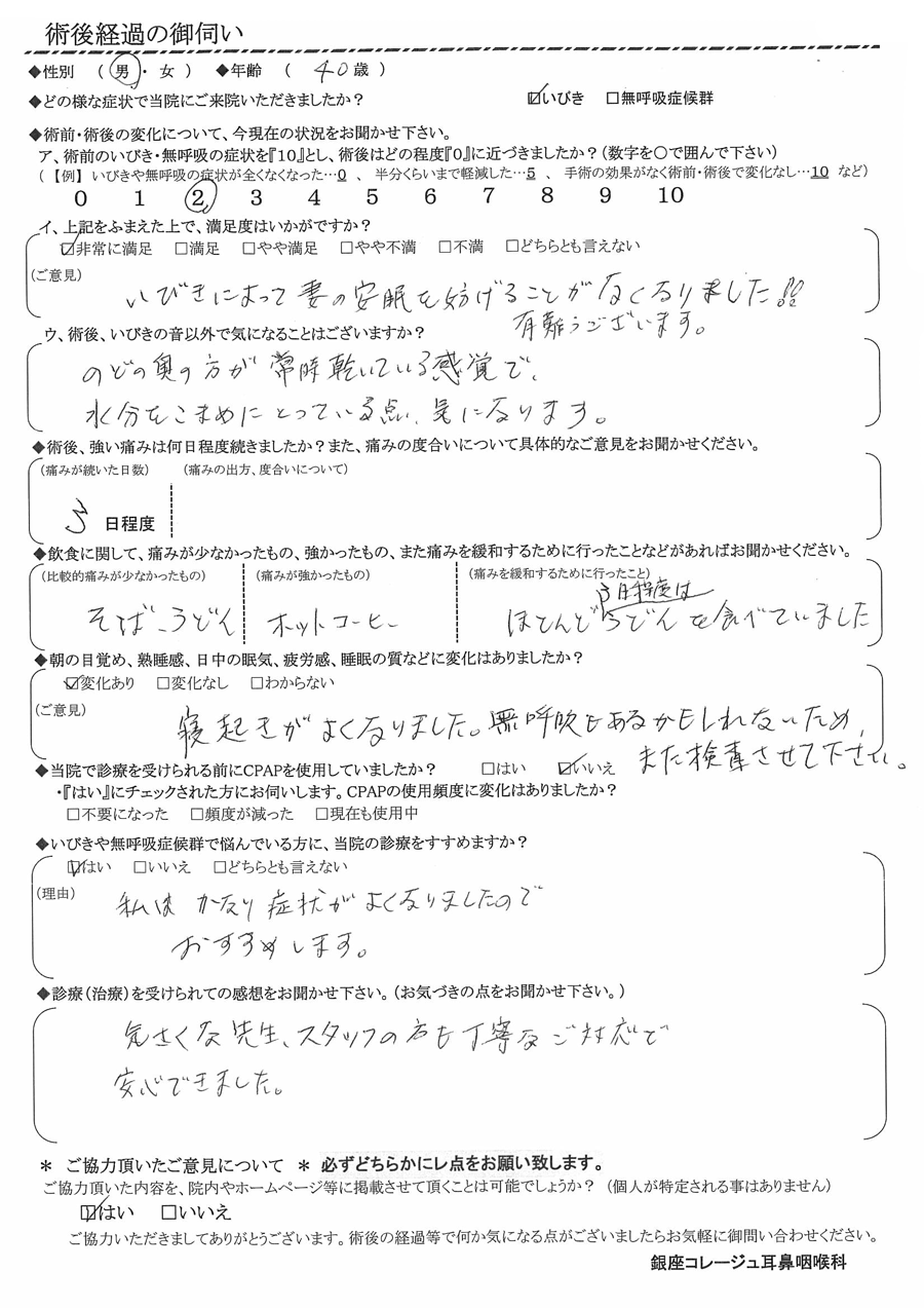 (ご意見) いびきによって妻の安眠を妨げる事が無くなりました!! ありがとうございます。