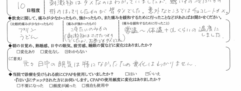 (痛みの程度について) 刺激物はダメなのは分かっていましたが、熱い物・冷たい物・形のハッキリした物がみんなダメでした。意外なところではチョコレートも×。