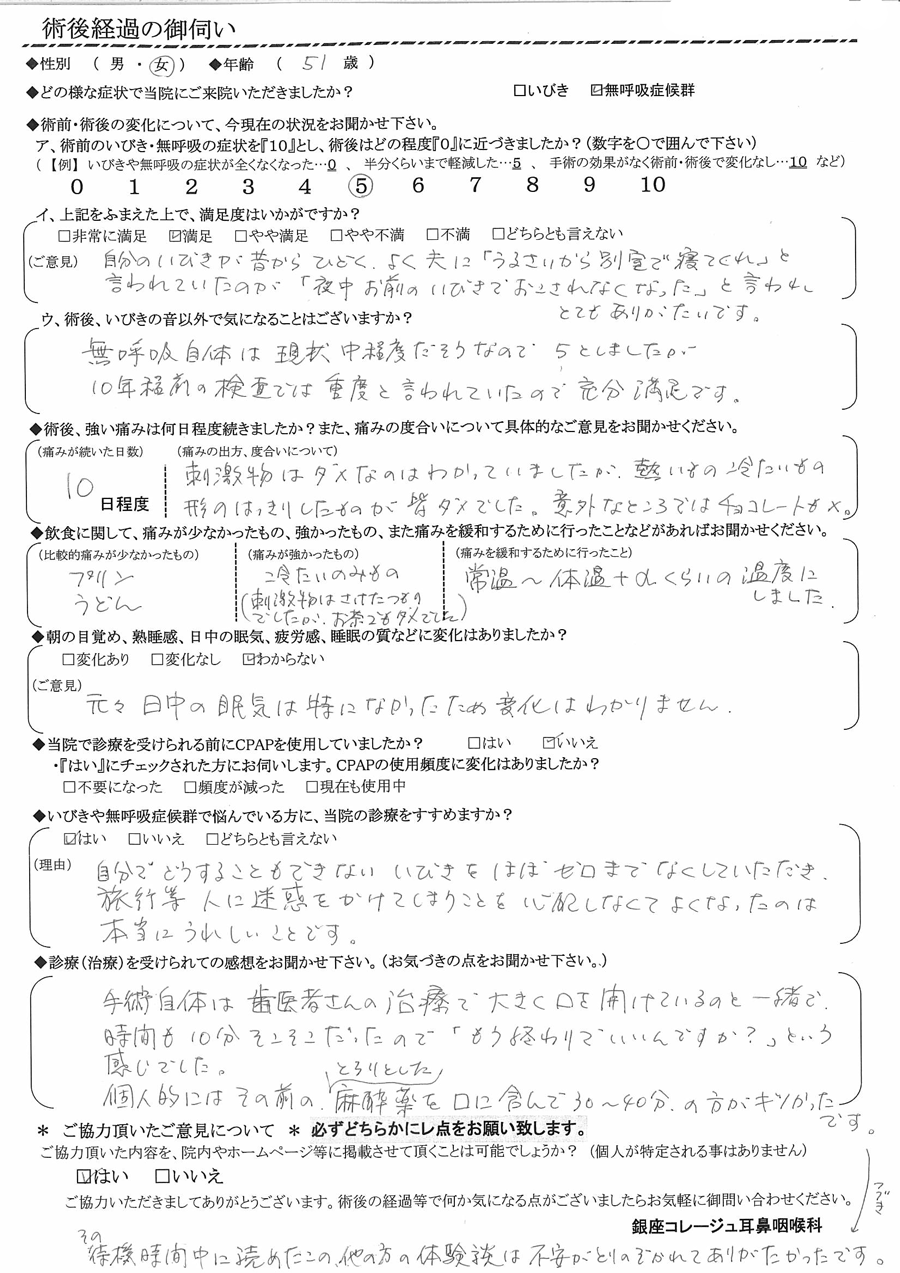 (理由) 自分でどうする事も出来ないいびきをほぼゼロまで無くして頂き、旅行など人に迷惑をかけてしまう事を心配しなくて良くなったのは本当に嬉しい事です。