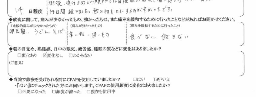 (ご意見) 毎日かいていたイビキがだいぶ軽減しましたが、全くかかない日は無く、疲れている時などは依然と同じ様に大きなイビキをかきます。でも、改善はしたので手術は受けて良かったと思います。
