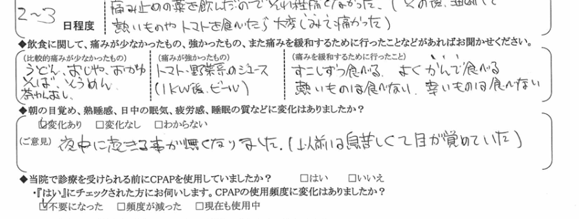 (痛みの程度について) 痛み止めの薬を飲んで、それ程痛くなかった。(その後、油断して熱い物やトマトを大変しみて痛かった。)